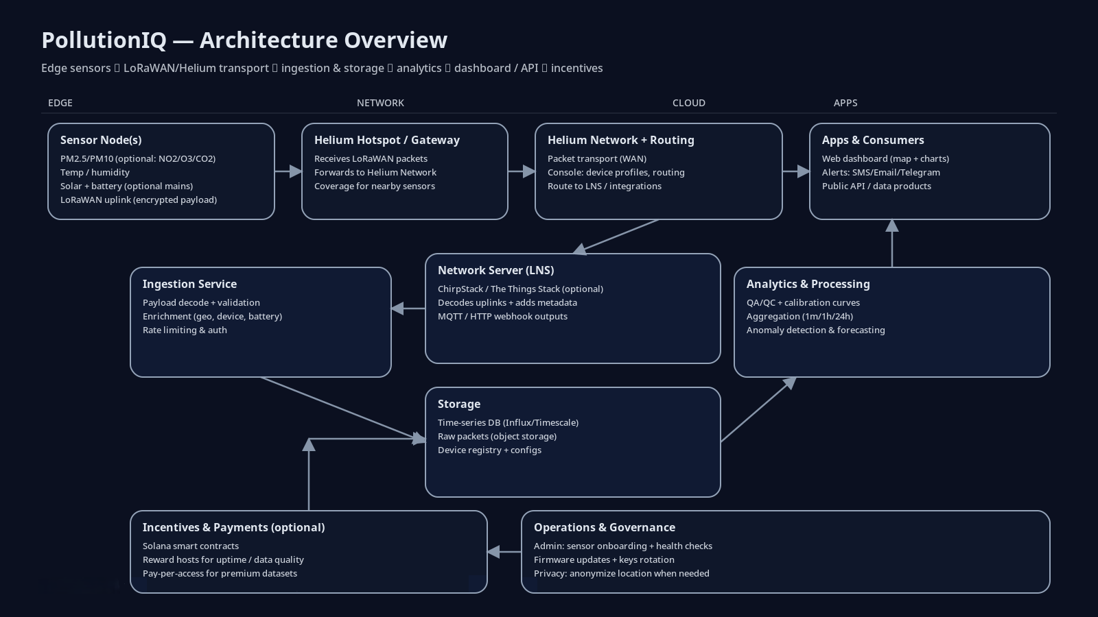 Sensor Node → Helium Hotspot → Helium Console (decode) → Dashboard & Storage → Public maps, charts, alerts, and API.